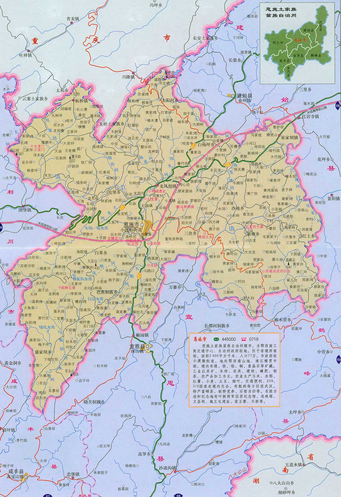 恩施土家族苗族自治州(簡(jiǎn)稱恩施州)位于湖北省西南部,東連荊楚,南接瀟湘,西臨渝黔,北靠神農(nóng)架,國(guó)土面積2.4萬(wàn)平方公里,轄恩施、利川兩市和建始、巴東、宣恩、來(lái)鳳、咸豐、鶴峰六縣。恩施州于1983年8月19日建州,是共和國(guó)最年輕的自治州,也是湖北省唯一的少數(shù)民族自治州。